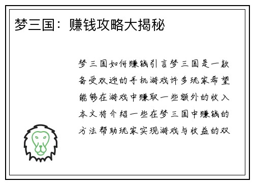 少年三国志五行迷阵如何玩攻略 在《少年三国志》这款游戏中,五行迷阵是一项非常重要的玩法,它不仅考验玩家的策略思维,还需要合理运用五行相生相克的原理。本文将从随机8-20个方面详细阐述五行迷阵的攻略,帮助玩家更好地应对挑战。 一、了解五行相生相克 在玩五行迷阵之前,首先需要了解五行相生相克的原理。五行相生是指金生水、水生木、木生火、火生土、土生金;五行相克是指金克木、木克土、土克水、水克火、火克金。...